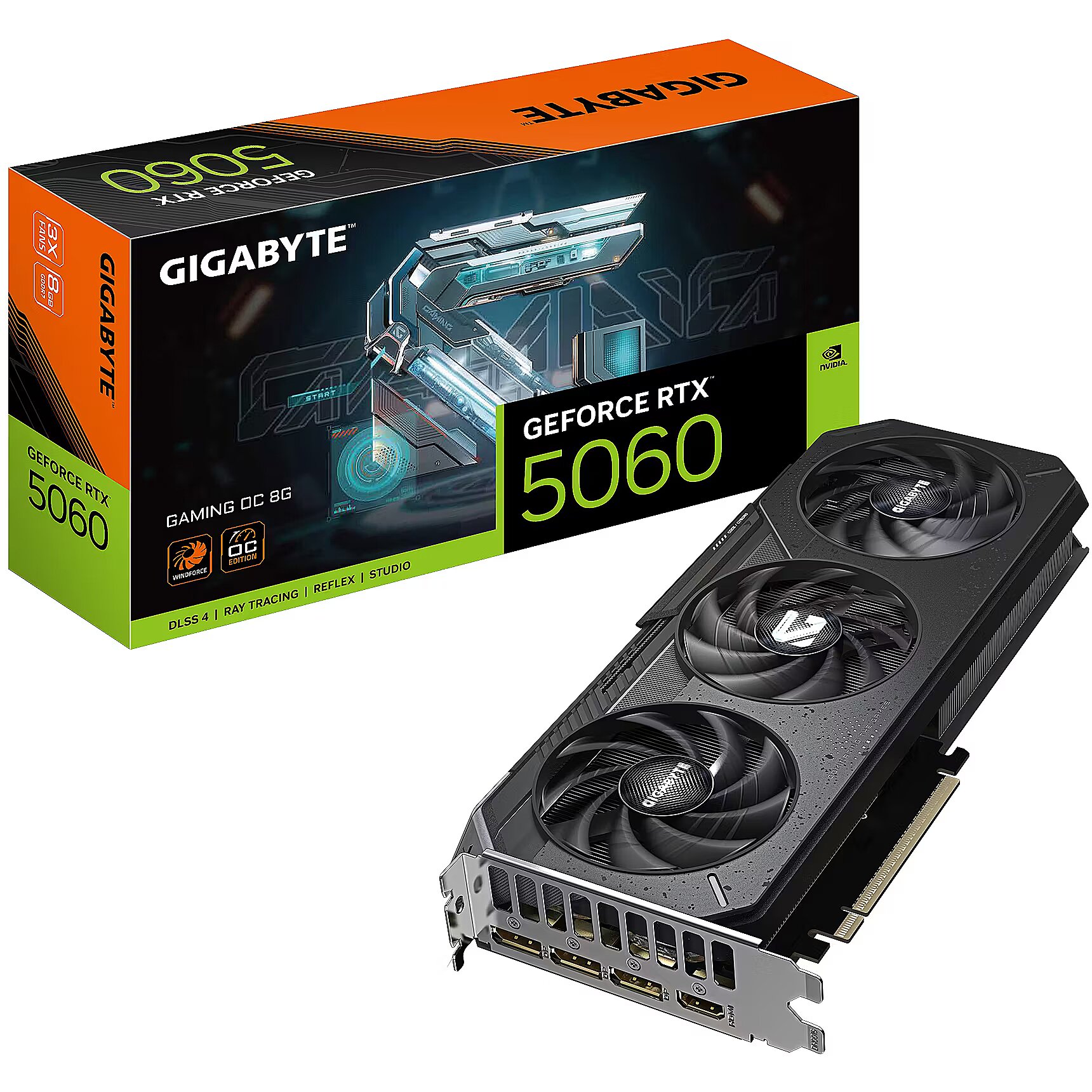 Summary - GIGABYTE GeForce RTX 5060 GAMING OC 8G Graphics Card - 8GB GDDR7, 128bit, PCI-E 5.0, 2595 MHz Core Clock, 3 x DisplayPort, 1 x HDMI, GV-N5060GAMING OC-8GD. Graphics processor family: NVIDIA, Graphics processor: GeForce RTX 5060, Processor frequency: 2595 MHz. Discrete graphics card memory: 8 GB, Graphics card memory type: GDDR7, Memory bus: 128 bit, Memory clock speed: 28000 MHz. Maximum resolution: 7680 x 4320 pixels. DirectX version: 12.0, OpenGL version: 4.6. Interface type: PCI Express 5.0. Cooling type: Active, Number of fans: 3 fan(s), Illumination colour: Multi