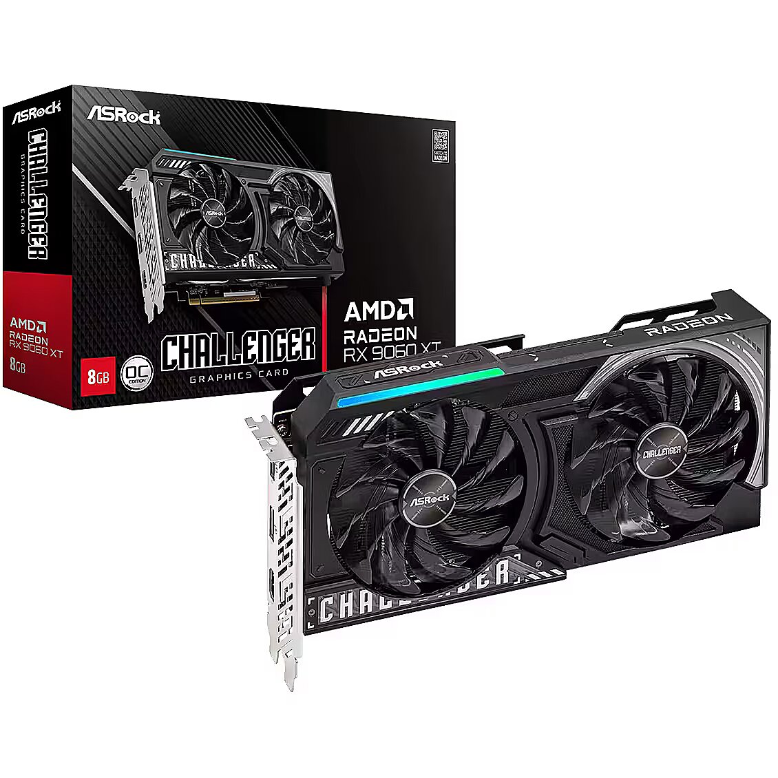 Summary - Asrock RX 9060 XT Challenger 8GB OC. Graphics processor family: AMD, Graphics processor: Radeon RX 9060 XT, Processor frequency: 2700 MHz. Discrete graphics card memory: 8 GB, Graphics card memory type: GDDR6, Memory bus: 128 bit. Maximum resolution: 7680 x 4320 pixels. DirectX version: 12 Ultimate, OpenGL version: 4.6. Interface type: PCI Express x16 5.0. Cooling type: Active, Number of fans: 2 fan(s)