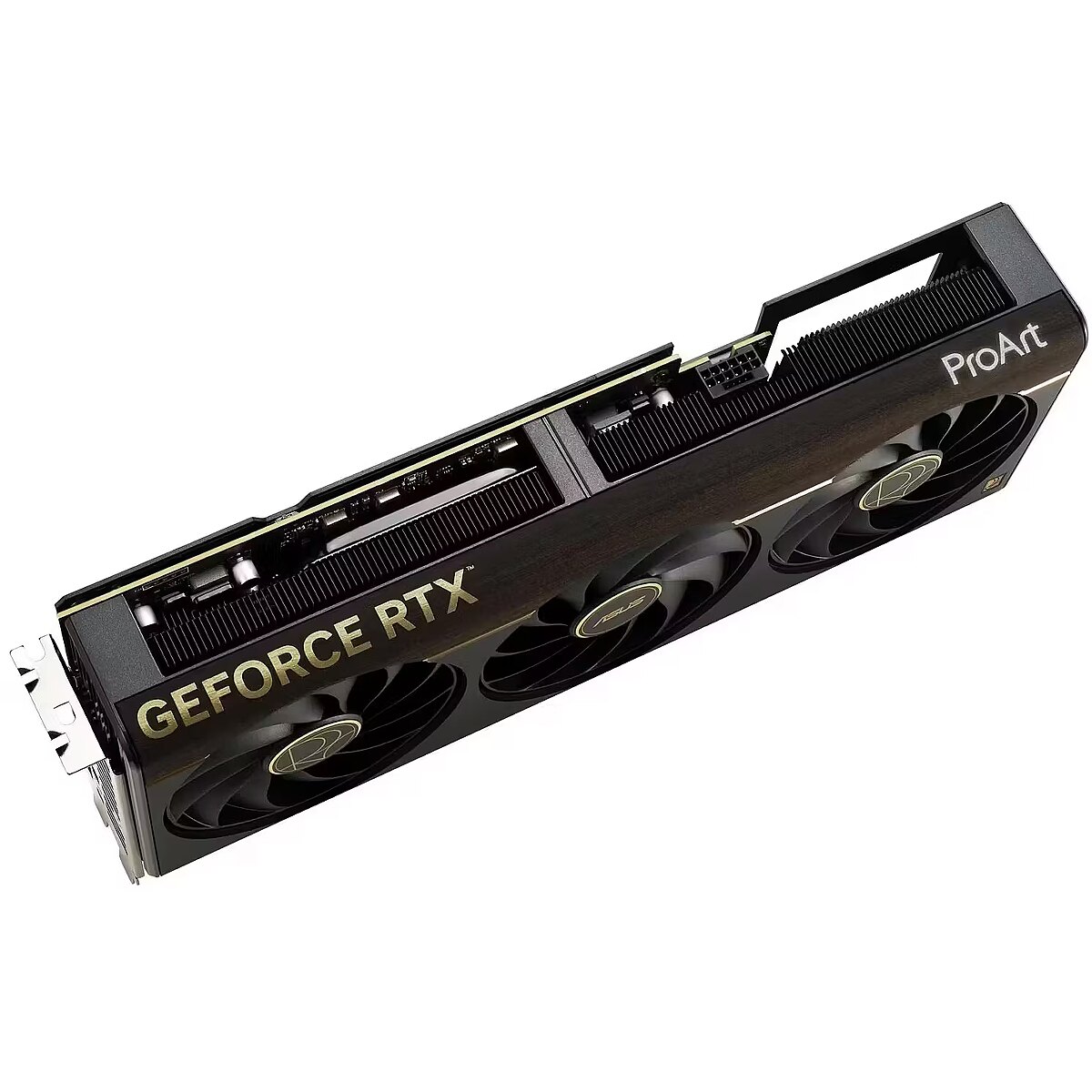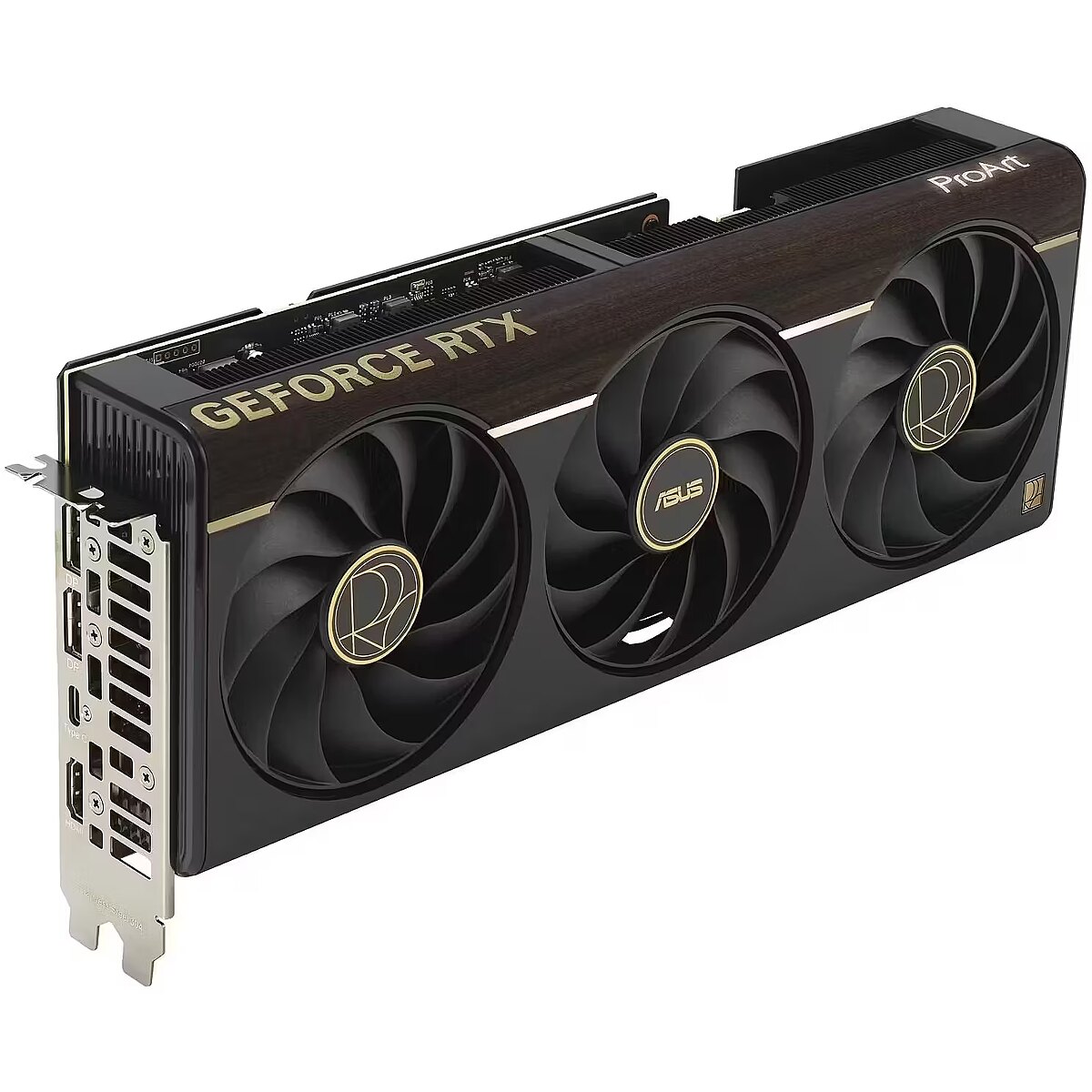 LongDesc - ProArt GeForce RTX™ 5080Visionary. Versatile. Timeless.The ProArt GeForce RTX™ 5080 combines a compact 2.5-slot design with potent cooling – three Axial-tech fans, a vapor chamber, and a phase-change GPU thermal pad – to deliver GeForce RTX 50 Series performance to both full-scale towers and space-saving SFF builds. A USB Type-C® port enhances versatility for content creation workflows, while a wood-patterned laminate trim and low-key Aura-lit logo help deliver a refined aesthetic.Build Small. Play Big.You can pack high performance into a smaller footprint with this SFF-Ready Enthusiast GeForce card. Look for cases that are compatible with SFF-Ready Enthusiast GeForce Cards to get a sure fit and streamline your PC build.Creator-Centric DesignUSB Type-C SupportProArt GeForce RTX 5080 comes with a USB Type-C output for connecting to a monitor capable of using the port to receive video. It also features two DisplayPort™ 2.1b ports and one HDMI® 2.1b port for multiple high-resolution displays, boosting productivity across creative workflows.Illuminated LogoThe refined, aura-lighted ProArt logo provides a subtle and elegant accent.Minimalist LooksThe brown wood-patterned laminate trim and refined ProArt gold elements seamlessly integrate into any designer's build for a clean and sophisticated aesthetic.Potent CoolingEfficient Cooling in Compact 2.5-Slot DesignThe ProArt GeForce RTX 5080 features a 2.5-slot design and an advanced cooling system with Axial-tech fans plus heatpipes and a vapor chamber for efficient heat dissipation. This combination helps ensure low temperatures, low noise, and high performance.Reverse Rotation and 0dB TechnologyThe two outer fans spin counterclockwise to minimize turbulence and to maximize air dispersion through the heatsink. All three fans come to a standstill when GPU temperatures are below 50°C, enabling you to perform light creative tasks in relative silence. Fans start up again when temps are over 55°C, referencing a speed curve that balances performance and acoustics for work or play.Vapor ChamberA vapor chamber, heatpipes and heatsink efficiently soak up heat from the GeForce RTX 5080 GPU, helping to ensure premium performance in a variety of scenarios.Vented BackplateLarge backplate vents significantly enhance heat dissipation, helping to keep temperatures nominal during intense tasks. This additional airflow helps ensure optimal temperatures, performance, longevity and stability.Dual BIOSPerformance mode lets the fans spin up to emphasize cooling, and Quiet mode keeps the same power target and top-end settings while offering a less aggressive fan curve for quieter operation at moderate temperatures.MaxContact DesignMaxContact is an ASUS-exclusive manufacturing technique that effectively increases the surface area of the GPU heat spreader by 5% for improved thermal efficiency.Phase-Change GPU Thermal PadBy melting to effectively fill the gaps between the GPU and the thermal module, a premium phase-change GPU thermal pad provides superior thermal conductivity and enhanced heat dissipation, ensuring optimal performance and longevity for graphics cards under heavy loads.Unmatched ReliabilityASUS GPU Guard & BracketASUS GPU Guard applies adhesive to secure all four corners to reduce the risk of cracks, while a GPU bracket helps ensure uniform mounting pressure and extra stability.Protective PCB CoatingA protective conformal coating envelops the circuit board to help protect against short-circuits caused by moisture, dust or debris.Auto−Extreme TechnologyThis ASUS-exclusive automated manufacturing process sets a standard in the industry by allowing all soldering to be completed in a single pass, reducing thermal strain on components and avoiding the use of harsh cleaning chemicals. This unique process leads to reduced environmental impact, lower manufacturing power consumption and a more reliable product overall.Pillar of SupportThe bundled graphics card holder banishes sag and also contains a screwdriver to help you build.RTX. It’s On.The Ultimate in Ray Tracing and AIRTX is the most advanced platform for full ray tracing and neural rendering technologies that are revolutionizing the ways we play and create. Over 700 games and applications use RTX to deliver realistic graphics and incredibly fast performance with cutting-edge AI features like DLSS Multi Frame Generation.CreatorsYour Creative AI-dvantageNVIDIA Studio is your creative advantage. GeForce RTX 50 Series GPUs unlock transformative performance in video editing, 3D rendering, and graphic design. Experience RTX accelerations in top creative apps, world-class NVIDIA Studio drivers engineered and continually updated to provide maximum stability, and a suite of exclusive tools that harness the power of RTX for AI-assisted creative workflows.