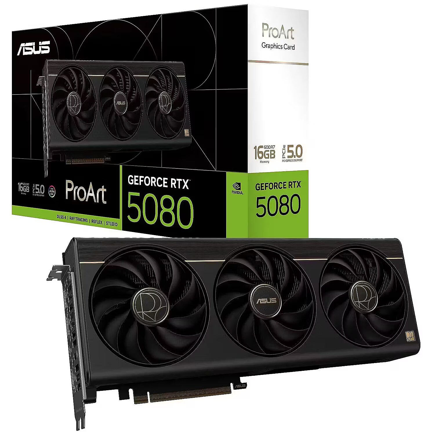 Summary - ASUS ProArt -RTX5080-O16G. Graphics processor family: NVIDIA, Graphics processor: GeForce RTX 5080. Discrete graphics card memory: 16 GB, Graphics card memory type: GDDR7, Memory bus: 256 bit. Maximum resolution: 7680 x 4320 pixels. DirectX version: 12 Ultimate, OpenGL version: 4.6. Interface type: PCI Express 5.0. Cooling type: Active, Number of fans: 3 fan(s), Illumination colour: Multi