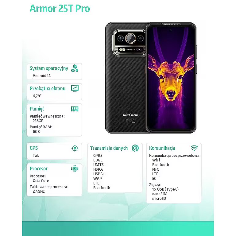 Summary - Ulefone Armor 25T Pro. Display diagonal: 17.2 cm (6.78"), Display resolution: 1080 x 2460 pixels. Processor family: MediaTek Dimensity, Processor model: 6300. RAM capacity: 6 GB, RAM type: LPDDR4X, Internal storage capacity: 256 GB. Rear camera resolution (numeric): 50 MP, Rear camera type: Dual camera. SIM card capability: Hybrid Dual SIM. Operating system installed: Android 14. Battery capacity: 6500 mAh. Product colour: Black. Weight: 326 g