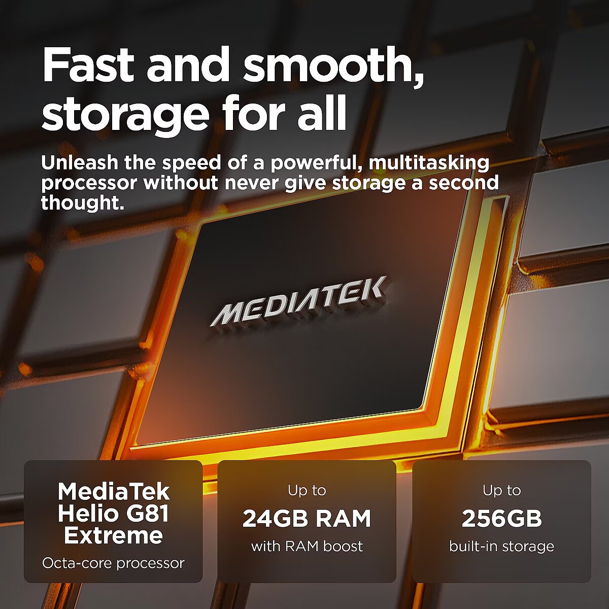 LongProductName - 6.72", LCD, 2400 x 1080, 391 ppi, MediaTek Helio G81 Extreme, 8GB LPDDR4X RAM, 256GB, microSD, 50MP + 5MP, 8MP, 3.5mm, Bluetooth 5.4, 802.11 a/b/g/n/ac, 6000mAh, USB Type-C, NFC, Android 15