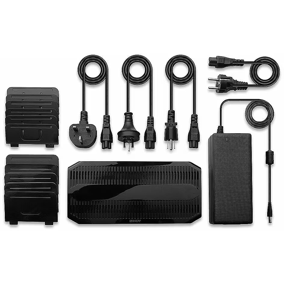 Description - 120W 10 Port USB Charging Station. The Lindy 120W 10 Port USB Charging Station allows charging up to 8 USB devices via Type A and 2 via Type C like tablets or smartphones. Each USB Type A port can provide up to 5V 2.4A, each USB Type C port can provide up to 5V 3A to satisfy the most power hungry devices. If all 10 ports are occupied and/or when total power draw is higher than 120W, load balancing will occur. With its smart charging function and support of many different protocols like QC 3.0 (only type C ports) , Samsung AFC and Apple 5V 2.4A Charging Protocol and BC 1.2 (only Type A ports) this USB Charging Station can recognise the connected device to automatically adjust the charging current for a fast and safe charge while also providing overcurrent, overvoltage and short-circuit protection to avoid excessive current damaging the device. Plastic dividers can be assembled and stood on the top of the unit, which allows different widths for different tablets or mobile phone sizes. This product is perfect for use in schools, libraries, hotels, restaurants or any location that uses multiple devices. Country specfic power cables are provided for seamless use of the charging station, ideal for global events or integration into installations abroad.