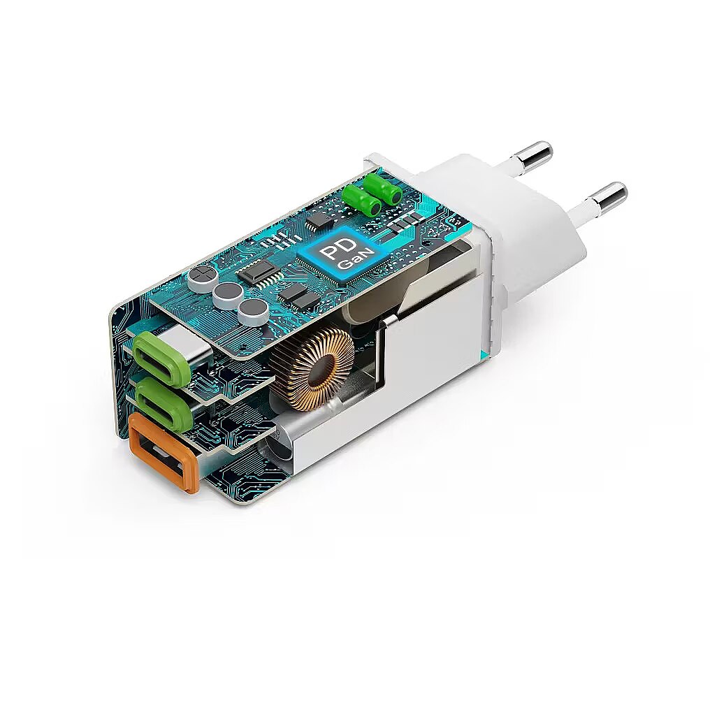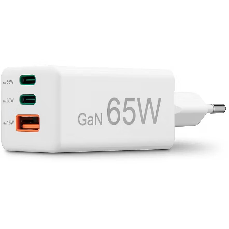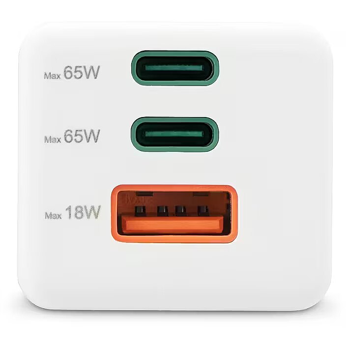Specyfikacja: Napięcie wejściowe: 100-240V Gniazda: 2 x USB-C oraz 1 x USB-A Ładowanie 1 urządzenia: Maks. moc USB-C1: 65 W Maks. moc USB-C2: 65 W Maks. moc USB-A: 18 W Ładowanie 2 urządzeń: Maks. moc USB-C1+ USB-C2: USB-C1: 45 W; USB-C2: 20 W Maks. moc USB-C1 + USB-A: USB-C1: 45 W; USB-A: 18 W Maks. moc USB-C2 + USB-A: USB-C2: 6 W; USB-A: 6 W Ładowanie 3 urządzeń: Maks. moc USB-C1 + USB-C2+USB-A: USB-C1: 45 W; USB-C2: 6 W; USB-A: 6 W