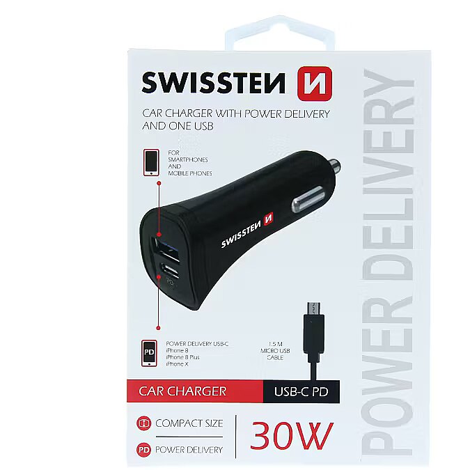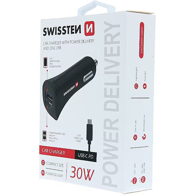 title_en - Swissten Power Delivery Car charger 12 / 24V / 2.4A / 30W + Micro USB Cable 1.5m
