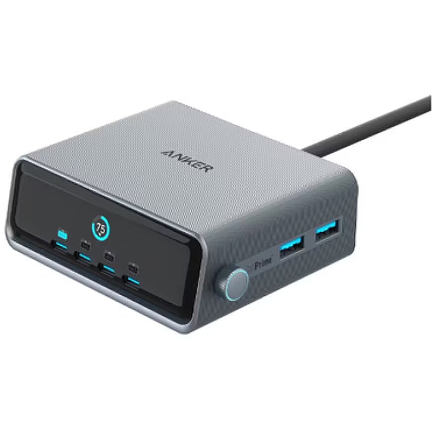 LongDesc - GaNPrime TechnologyAnker's GaNPrime technology redefines what you can expect from a charger, combining cutting-edge GaN efficiency with compact design, and intelligent power management thanks to PowerIQ 4.0. Ultra-Powerful 250W Charging StationDesigned for the power user, this charger delivers a substantial 250W across six ports, perfect for simultaneously powering up laptops, tablets, and phones. Master Your PowerTake advantage of precise power management with the 2.26" LCD display and smart control dial, enabling intuitive adjustments and real-time charging feedback, ensuring optimal power for each device. Ultimate Safety and CompatibilityKeep your devices secure with ActiveShield 3.0, which monitors temperature over 6 million times per day, while ensuring compatibility with a wide range of devices.