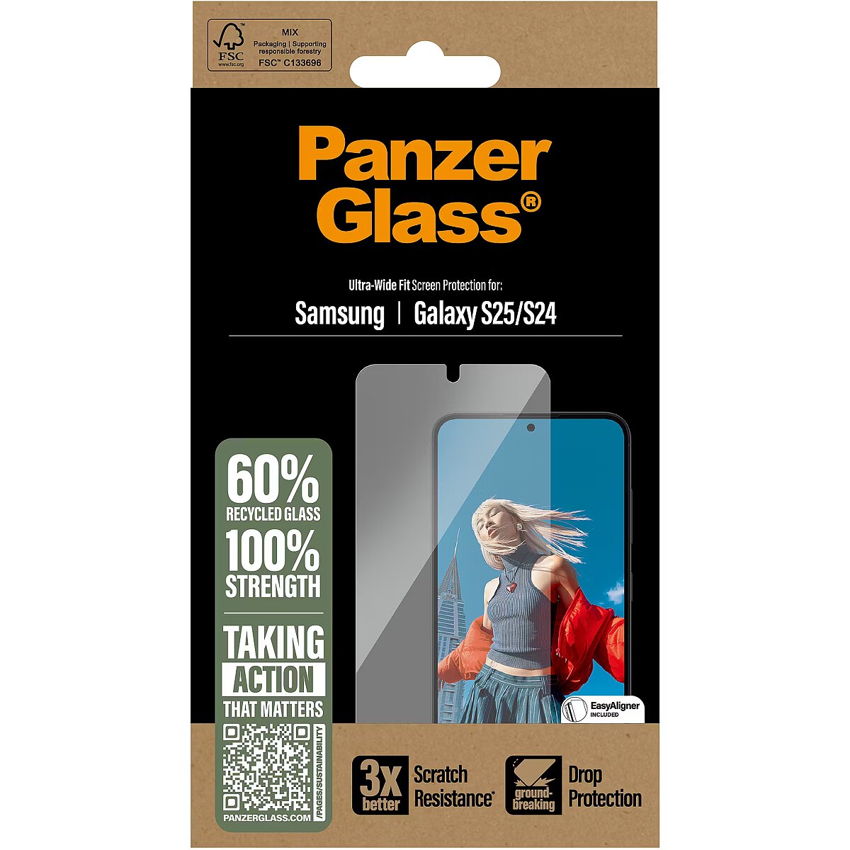 LongDesc - 60% recycled glass. 100% strength. 100% original. With high-level scratch resistance, impressive shock-resistance capabilities, and groundbreaking drop protection, this PanzerGlass® screen protector shields your phone screen from accidental bumps, crushing falls, and other hazards of everyday life. It’s made of almost two-thirds recycled glass and even has a smudge-free coating that reduces traces of fingerprints and grease to provide you with a clear screen view. With the enclosed EasyAligner made of 100% recycled plastic, installation is a piece of cake (seriously!). To make it even easier, we’ve included step-by-step instructions as well as a QR code for quick access to our online how-to video. And remember: Once installed, you’ll never again fear your phone falling screen-first. This might not happen, but then again … it might!   This screen protection prolongs the lifetime of your phone so that one day you can pass it on to someone else who will love it just as much as you do. It’s the new circle of phone life and one way of working toward a more sustainable future. Another is to use less packaging. In 2024, we reduced the amount of paper in our PanzerGlass® core product packaging design by an average of 66%*. So, of course, this product comes in a recyclable FSC™-certified box. The screen protector is Ultra-Wide Fit. This means it covers the front surface of your phone, providing a complete view of your screen while leaving a little room around the edges for a PanzerGlass® case, for example, a fearlessly fashionable case from CARE by PanzerGlass®. And if you’re thinking: “What if my camera lenses get scratched?” Well, help is just a few clicks away: Combine your screen protector and case with PanzerGlass® PicturePerfect or Hoops®. *Reduction from 2022-2024 measured by comparing selected products from the PanzerGlass® core range.