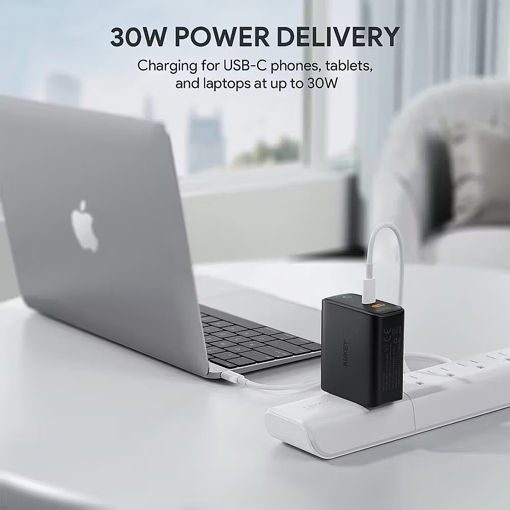 Description - The AUKEY PA-D2 is a new power delivery charger with Dynamic Detect. It charges a single USB-C device with up to 30 watts of power or, when a second device is connected, intelligently shares this power while charging two devices simultaneously (18 watts + 18 watts). Fast charging: Quickly charge phones, small laptops, tablets or other compatible USB-C devices that support USB Power Delivery. Safe and reliable: Built-in protections protect your devices from over-current, overheating and overcharging. AUKEY's new Dynamic Detect technology allows all power to be directed to a single port, instead of inefficiently sharing power across unused ports. Dynamic Detect When one device is connected the AUKEY USB PD charger with Dynamic Detect ensures that full charger power is available. When more than one device is connected, the Dynamic Detect function ensures efficient simultaneous charging by intelligently distributing this power (18W + 18W).