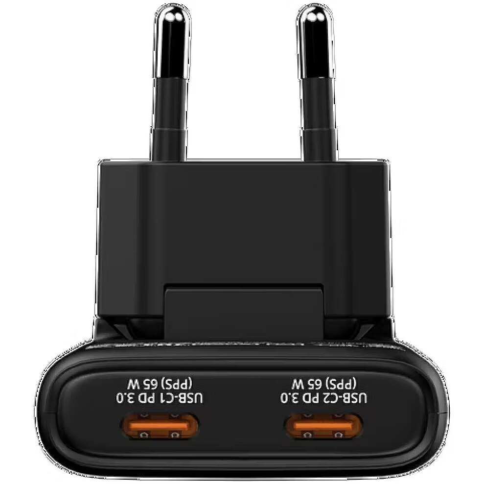 Technical Specifications: Output Power: up to 65 W Output Ports: 2 × USB-C (Power Delivery 3.0 / PPS) Input: AC 100–240 V, 50/60 Hz Protections: short-circuit, overcurrent, overvoltage, overheating Additional Features: foldable plug, travel-friendly design
