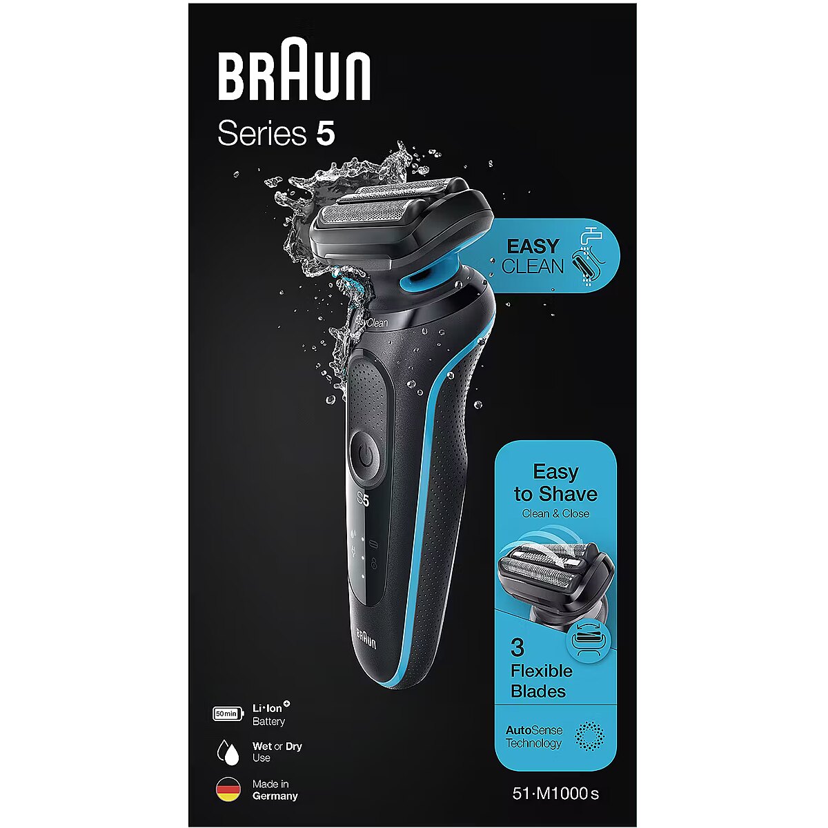 LongSummaryDescription - Braun Series 5 51-M1000s. Shaver system: Foil shaver, Product colour: Black, Blue, Shaving system technologies: AutoSense. Power source: Battery, Battery technology: Lithium-Ion (Li-Ion), Battery type: Built-in battery