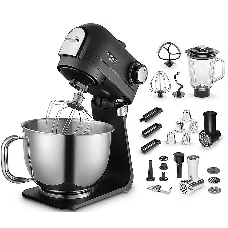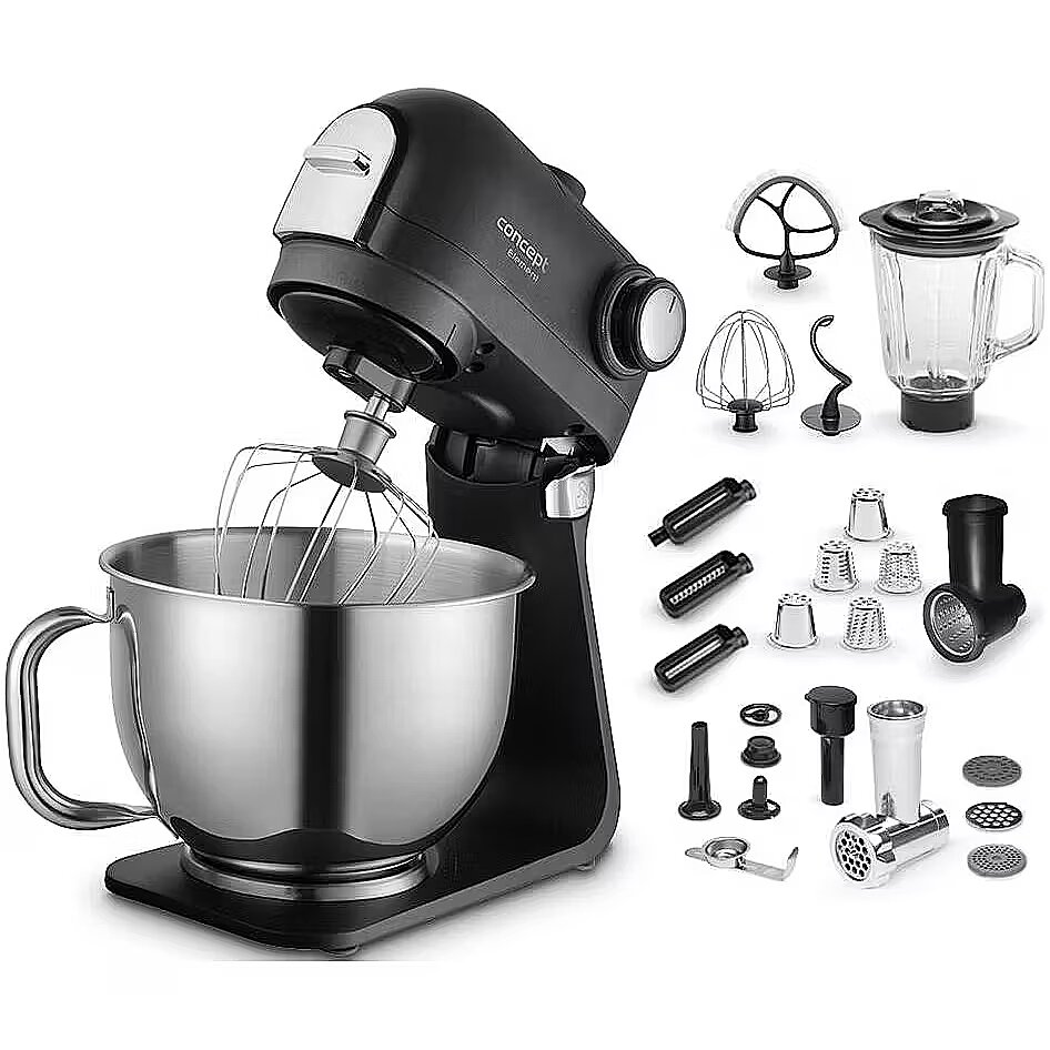 Accessories included - 5-litrowa misa ze stali nierdzewnej z uchwytem + pokrywka W pełni metalowe mieszadła: flexi trzepaczka, trzepaczka do ubijania, hak do ciasta Szklany blender o pojemności 1,5 l Maszynka do mięsa (3 wymienne tarcze o różnej grubości mielenia) + przystawki do napełniania parówek i kiełbas + przystawka do formowania ciastek 3 przystawki do makaronu (lasagne, trenette, tagliatelle) Tarka z 5 wymiennymi przystawkami