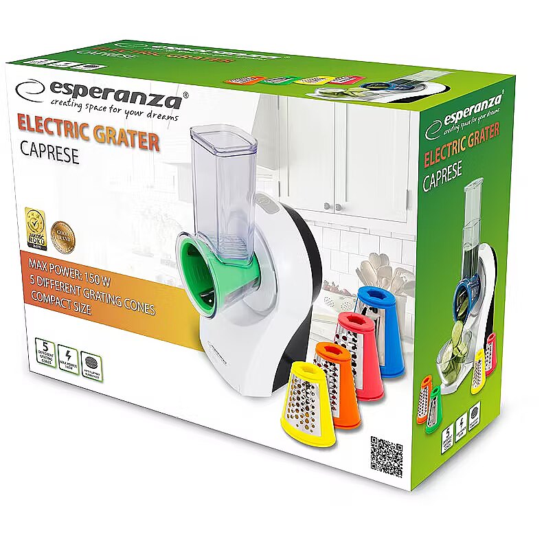 Description - Esperanza electric grater is ideal for processing fruit, vegetables, hard cheese, chocolate, nuts and also for making buns crumbs. The 5 interchangeable grating cones allow you to adjust the shape and thickness of food to the specificity of a specific dish. It can greatly speed up the preparation of salads, soup and homemade dinners. The compact size and stylish design make it essential for every kitchen.