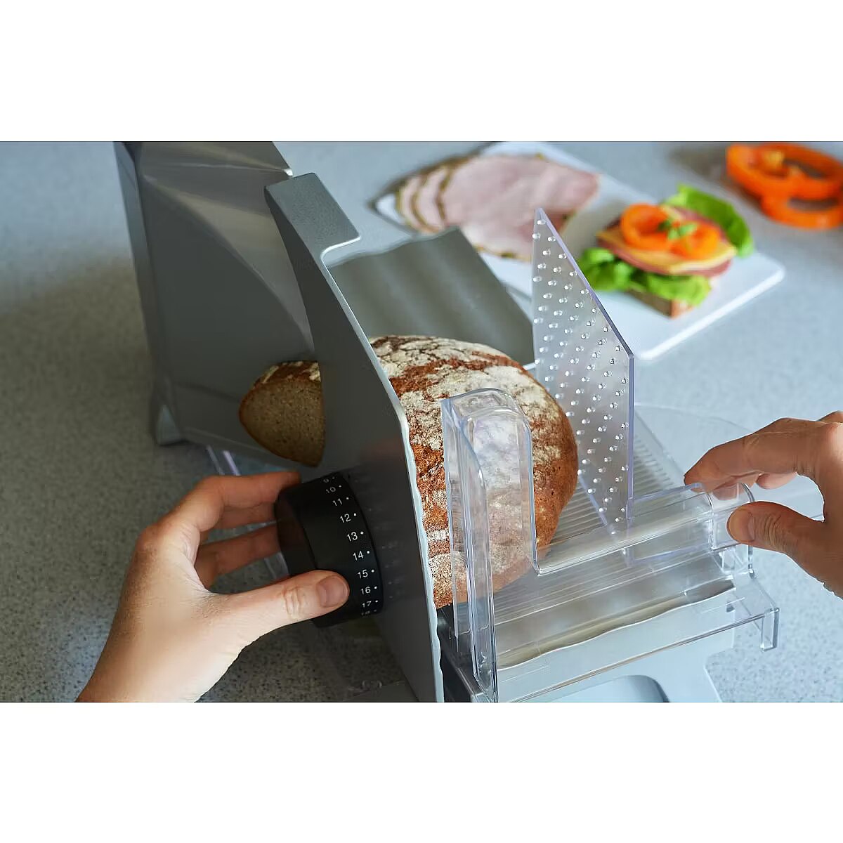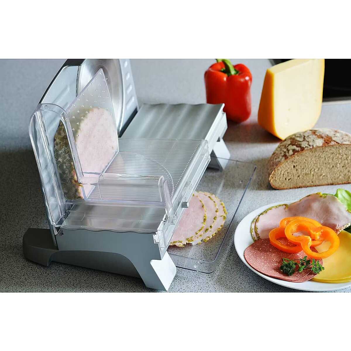 Description - Electric food slicer Sliced bread, sliced cheese or meat cut into perfectly even portions are the products you can nowadays buy in every store. However, if you are a person who shops consciously, appreciates the quality of food and has their own preferences as to the thickness of a slice of bread or a slice of ham, you will certainly appreciate the advantages of the Blaupunkt FMS501 electric slicer. The most important element of the slicer is a rotary blade with a diameter of 17 cm, made of high quality stainless steel. Equally important is the cast-aluminium adjuster, which controls the thickness of the slices, maintaining a stable angle with a clearance, and the removable feeder for feeding products to be cut with the blade. The sturdy aluminium base of the slicer has grooves on the sides to guide the feeder. This solution allowed to minimise the number of crumbs which can accumulate in the grooves during slicing, while at the same time making them easier to clean. The set also includes a pusher to help you cut products precisely and protect your fingers from the blade, and a tray for slices and crumbs. The feeder, pusher and tray are made of plastic which is safe for your health. All these can be easily removed from the slicer and cleaned under running water. The FMS501 model allows a wide range of slice thickness adjustment from less than 1 mm up to 20 mm. The smooth adjustment of the slice thickness is made possible by a convenient knob placed at the back of the adjuster, with a clear scale, thanks to which you can be sure that the device will cut bread, cheese or meat exactly into such slices you need at the given moment. Safety and stability of the appliance during operation is ensured by non-slip feet, blade guard and pulse mode (the device operates only when the switch is pressed). For advanced users, continuous operation will be convenient, with no need to keep the switch pressed. There is also a power cord compartment in the slicer housing, into which excess cord can be inserted and hidden for convenience of use and aesthetics of the worktop. The slicer blade can be replaced. The manufacturers product range includes both smooth and serrated blades (smooth blade - accessory ACC037 and serrated blade - accessory ACC038).