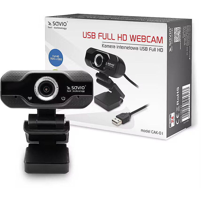 Description - USB FULL HD WEBCAM SAVIO CAK-01 supports up to 1920×1080 30Hz with built-in microphone. Sensor: CMOS Interface: USB Supported resolution: 1920×1080 Frame rate: 30 frames/s Camera angle of view: 120 Photo format: BMP, JPG Recording format:  MP4 Depth of field: 50 cm to infinity Built-in noise canceling microphone: yes Manual focus: yes Mounting bracket: yes Cable length: 1.5 m Compatibility with systems: Windows 7, 8, 10, MacOS, Linux Plug & Play (no drivers required)