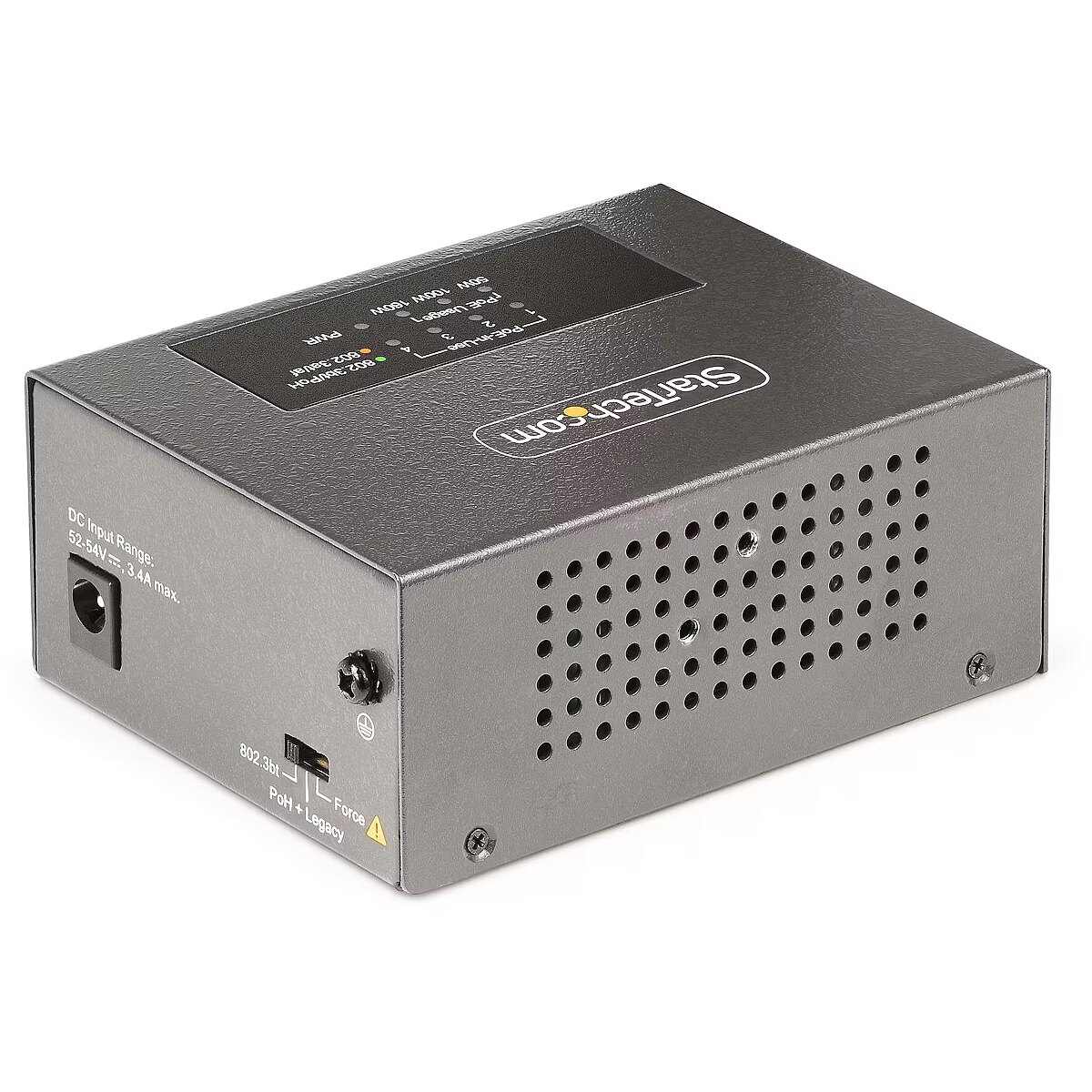 LongDesc - Supply power and data to up to four remote Powered Devices (PDs) with this PoE/PoE+/PoE++ injectorThis 4-Port Multi-Gigabit PoE++ Injector Hub serves as Power Sourcing Equipment (PSE) and enables multigigabit speeds of 5Gbps, 2.5Gbps, 1Gbps, 100Mbps, and 10Mbps across four Ethernet ports. This mid/end-span injector is capable of transmitting network data and power up to 328ft (100m) for remote installations. The PoE, PoE+, PoE++ compatibility and selectable power output ensure seamless compatibility with Powered Devices (PD). The TAA-compliant injector includes a Universal Power Adapter for different regions (NA/JP, EU, UK, and ANZ).Versatile PoE InjectorMultiport PoE Injector supports the IEEE 802.3af, 802.3at, and 802.3bt (Type 3 and Type 4) standards for Power Sourcing Equipment (PSE), delivering up to 52V DC and 95Watts. This flexibility eliminates the need for a separate power source for remote networked devices such as IP cameras, access control devices, remote kiosks (POSs), wireless access points, PoE lighting, and digital signage.Experience streamlined cable management with all network cables routed from one side of the unit for a clean and organized setup.Flexible Power OptionsTailor the power output to the specific needs of the device using the Power Output Switch. The options include 90W, 95W PoH, or legacy 60W (for UPoE/UPoE+) for all the ports on the PoE Injector Adapter.The Level-4 ESD protection (15kV air and 8kV contact) enhances device safety and reduces EMI for stable operation, minimizing the risk of downtime and hardware failures.Increased Network SpeedsThe unmanaged PoE Injector with NBASE-T technology provides access to an increased bandwidth up to 5Gbps, significantly reducing network slowdowns during data-intensive applications such as streaming high-definition video feeds, high-speed Internet, access local network resources, online or local network backups, and FTP access.The StarTech.com Advantage