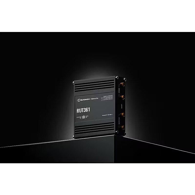 Summary - Teltonika Industrial 4G LTE router RUT361 Cat 6 LTE, WiFi 4, 2x RJ45 100Mb/s, IP30. Device type: Cellular network router, Product colour: Black, Housing material: Aluminium. Ethernet LAN interface type: Fast Ethernet, Ethernet LAN data rates: 10,100 Mbit/s, Networking standards: IEEE 802.11b, IEEE 802.11e, IEEE 802.11g, IEEE 802.11k, IEEE 802.11n, IEEE 802.11r, IEEE 802.11s,.... Wi-Fi standards: 802.11b, 802.11g, Wi-Fi 4 (802.11n), WLAN data transfer rates supported: 300 Mbit/s, Wi-Fi frequency: 2.4 GHz. Data network: 3G, LTE, SIM card type: MiniSIM, Data transfer rate (LTE) (download): 300 Mbit/s. Security algorithms: AES-CCMP, OWE, TKIP, WPA-PSK, WPA2-EAP, WPA2-Enterprise-PEAP, WPA2-PSK, WPA3-EAP, WPA3-SAE, VPN support: OpenVPN IPsec GRE PPTP, L2TP