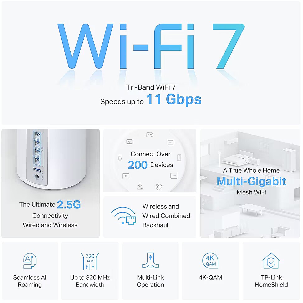 Description - BE9300 Whole Home Mesh WiFi 7 System 9.3 Gbps Tri-Band WiFi – 5764 Mbps (6 GHz) + 2882 Mbps (5 GHz) + 688 Mbps (2.4 GHz).† 2.5 Gbps Wired Connections – 4× 2.5 Gbps ports ensure max flexibility and boosted throughput.§ Wireless and Wired Combined Backhaul – Connects a wireless and wired backhaul with each unit simultaneously to improve overall throughput and reduce latency. Multi-Link Operation (MLO) – Simultaneously send and receive data across different bands and channels to increase throughput, reduce latency, and improve reliability. 320 MHz Channels – Double the bandwidth and enables many more simultaneous transmissions at the fastest possible speeds. Works on the 6 GHz Band – Minimizes congestion with greenfield spectrum, delivering robust high-speed connections. TP-Link HomeShield – Provides comprehensive network protection, robust parental controls, and real-time IoT security. Universal Compatibility – Backward compatible with all WiFi generations and works with any internet service provider (ISP) and modem.