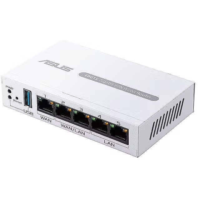 LongDesc - ASUS ExpertWiFi EBG15 Gigabit VPN Wired RouterYour Business Network Expert Within ReachThe ASUS ExpertWiFi EBG15 provides a fast, secure and scalable network with rich features tailored for small-to-midsized businesses. EBG15 enhances network stability through Ethernet connectivity and provides internet backup with two WAN/LAN ports and one USB port to support business operations. As businesses expand, owners can connect the EBG15 to the switch and access point for broader coverage, ensuring the scalability and extendability of ExpertWiFi.For remote employees or small business owners, ExpertWiFi provides stable and reliable internet connections. And with comprehensive VPN protocols, users can access their networks with site-to-site VPNs for encrypted office or home network connections, easily and securely.ExpertWiFi provides an all-new platform for innovative business services. Brand information and advertising can be promoted via the Guest Portal feature to engage with your customers in different ways.ExpertWiFi networking products are prepared to scale to customer needs. Businesses can greatly expand the size of their network when using ExpertWiFi devices.To help protect data and information, the ExpertWiFi series offers commercial-grade network security through a free subscription to ASUS AiProtection Pro and Safe Browsing features.Fast, Versatile Connectivity to Accommodate the Business ScenariosFor a larger or multi-story space, you can build a strong and stable network by connecting the EBG15 gigabit VPN wired router and the EBP15 PoE+ switch to three EBA63 PoE access points. If you require additional network coverage, you can easily add more EBA63 units to your existing business network.Maximize Performance withASUS ExpertWiFi PoE+ Switch and PoE APASUS ExpertWiFi networking products are designed for easy scalability to fit a variety of SMB scenarios. By integrating ExpertWiFi series products, you can extend your business network coverage and access a complete suite of ExpertWiFi’s software features to boost your business operations. You can also connect the ExpertWiFi products with ASUS AiMesh extendable routers.*The ASUS ExpertWiFi series is compatible with ASUS AiMesh products; however, the functionality of software features is subject to the capabilities of the primary router. The availability of some ExpertWiFi features may also depend on whether the AiMesh router supports them.Secure and Efficient Business Operation with VLANThe ExpertWiFi series supports virtual local area network (VLAN)* management for enhanced security of your business. VLAN management enables an easy, fast and flexible way to segment wired and wireless networks, with support for a dedicated Ethernet port to provide even more data protection.Easy Settings for Your Business via the ExpertWiFi AppSuitable for Business ApplicationsThe compact ExpertWiFi EBG15, at 121x75x26 mm, fits in the low voltage wiring box. Its site-to-site VPN enables secure connections and resource sharing across locations. With two WAN/LAN ports and a USB port for backups, it ensures stable connectivity.The EBG15 provides reliable and stable internet access for business owners. In addition to two WAN/LAN ports that can be set as backup WAN, you can also set the USB port as a backup WAN by connecting it to your mobile phone with a hotspot. No complicated setup is needed—just plug it in and use it.Environment CertificationASUS ExpertWiFi is stringently tested to meet the requirements of world-leading sustainability certifications. These tests include a comprehensive database of up-to-date criteria, independent verification and a structured system for continuous improvement.Eco-Friendly PackagingAll ExpertWiFi products come with environmentally friendly packaging sourced from FSC-certified responsible forestry, and they benefit from more active management of the use of chemicals in the production process, to improve the recycling of packaging and substances, and to reduce environmental impact.