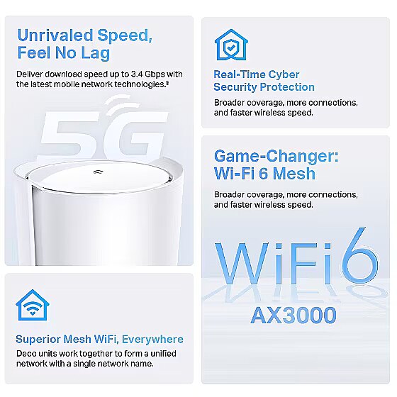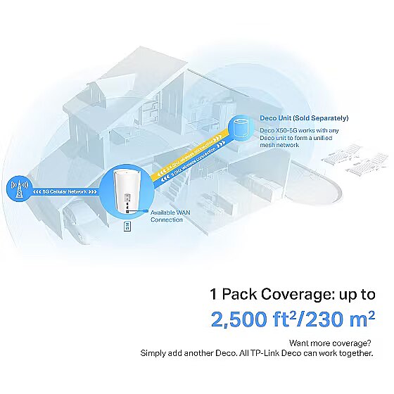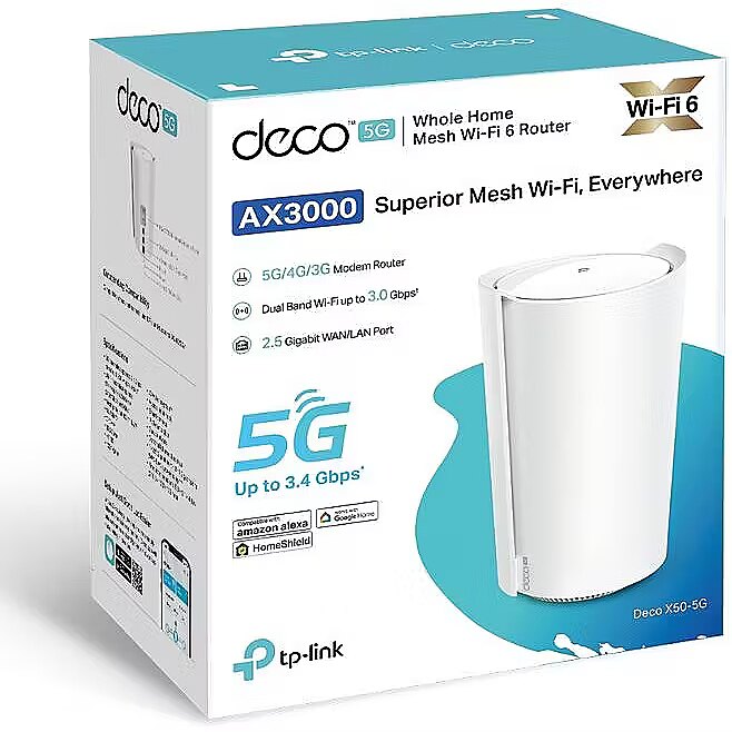 LongDesc - Lower Latency,Enhanced CapacityWith massive MIMO, optimized OFDM, and more, 5G technologies brings fast responsive network connections to tomorrow’s mobile devices, with only 1 ms latency. Enjoy your online streaming, gaming, and AR / VR without congestion. Plug and Play, Enjoy 5G Network EverywhereSimple, just one SIM cardTraditional broadband or cable installation is expensive and time-consuming for your vacation home, farm, or suburban warehouse. Long contract periods also create headaches for short-rentals, pop-up venues, and temporary shops to access the internet. Deco X50-5G ensures a comfortable and no-block network installation. Plug in your SIM card and enjoy high-speed internet!WiFi 6 Upgrades EverythingArmed with WiFi 6 technology, Deco whole home mesh WiFi is designed to deliver a huge boost in coverage, speed, and total capacity. Get on the latest mesh WiFi to enjoy the future network that loads faster and connects more.Deco products are aimed to dramatically improve capacity and efficiency in traffic-dense environments. No matter how many screens or devices are on at once, everyone is able to enjoy a more efficient network that loads faster without dragging down performance.†Better Signal for Connections EverywhereWith advanced 2.5 Gigabit port, Deco X50-5G provides reliable, warp-speed connections for high-intensive wired devices. When it’s set as a wireless router, both Ethernet ports support being used as backup broadband access points.Furthermore, two external antenna ports allow external antenna access which can receive 5G/4G signals more effectively, resulting in improved 5G/4G performance.Seamless Roaming with One WiFi NameTP-Link Mesh means Deco units work together to form one unified network. Your phone or tablet automatically connects to the fastest Deco as you move through your home, creating a truly seamless WiFi experience.Whole Home CoverageEliminate weak signal areas throughout your houseSmart RoamingUninterrupted streaming when moving between roomsOne WiFi NameNo more switching WiFi network namesUnified ManagementControl your home WiFi by managing the central node via the Deco AppSmart Security for Smart LivingHomeShield provides a series of built-in services that protect all your devices comprehensively with various features for when you’re at home or on the go. With HomeShield, safer internet experiences bring more happiness to your smart living.Parental ControlsSimply configure your gateway and achieve whole home network security. HomeShield examines your network by scanning and identifying potential risks, stopping them in their tracks before they harm your network.*Maintain Protection Away from HomeParental Controls protect your kids, while helping them maintain healthy digital habits. Parents can set app blocking, web filtering, YouTube restrictions, SafeSearch, and online time limits to keep kids safe while they’re having fun online.*Quality of Service (QoS)KidShield AppDevices Security AppDevices remain secure everywhere with devices security app. And through KidShield, parents can monitor their kids’ locations and set geofencing. This way, kids stay digitally protected even on the go.*Simple. Easy. Yet Powerful.Setup and manage your network anytime and anywhere on the friendly TP-Link Deco app. In just three easy steps your entire home can be blanketed in strong and reliable WiFi.Easy ManagementManage your WiFi at home or away on the Deco app. See every connected device, prioritize your own, and set up a guest network.Voice ControlUse an Amazon Alexa or Google Assistant-enabled device to control Deco X50-5G with just your voice.All Decos Work TogetherDeco X50-5G is compatible with every other Deco model to form a Mesh network. Expand Mesh WiFi coverage anytime by adding more Decos.