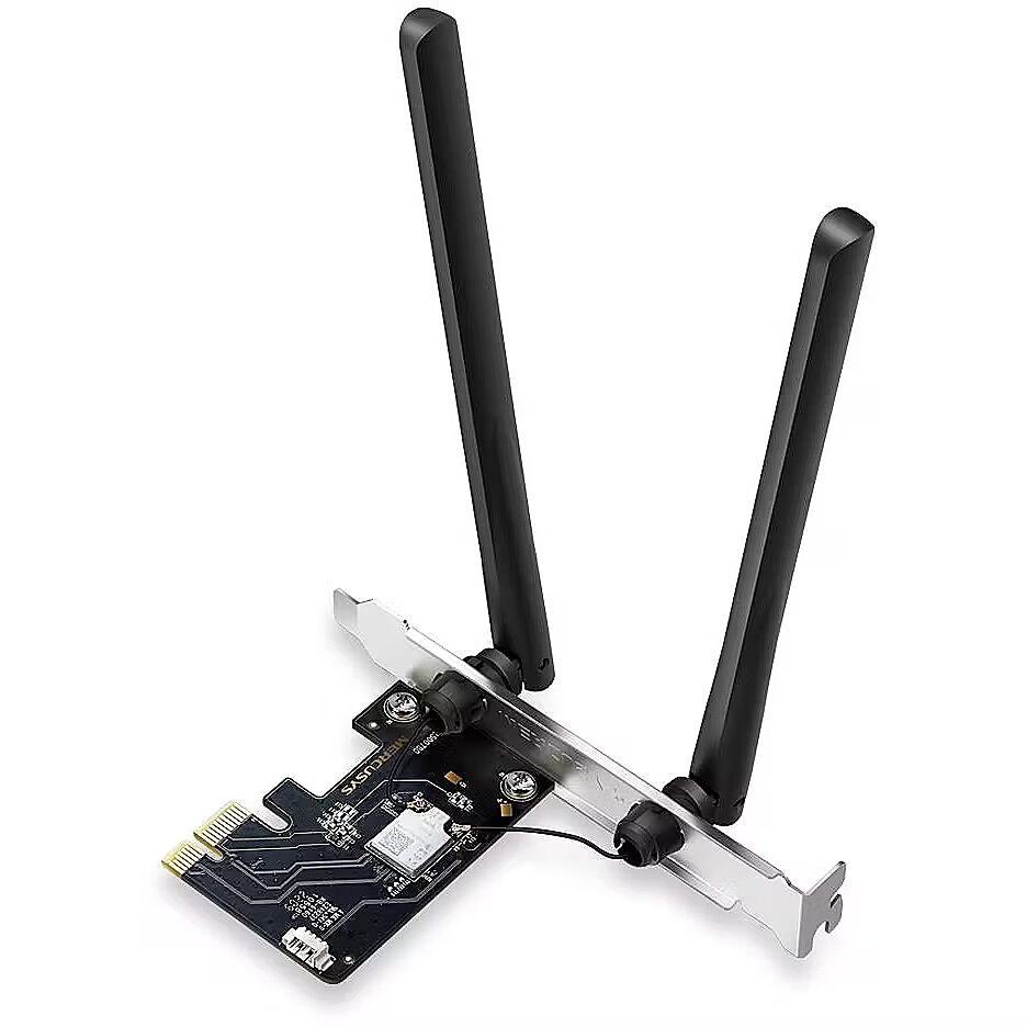 Description - AXE5400 Wi-Fi 6E Bluetooth 5.2 PCIe Adapter Unstoppable Tri-Band Speed — Speeds up to 2402 Mbps (6 GHz) + 2402 Mbps (5 GHz) + 574 Mbps (2.4 GHz) WiFi 6E Standard — Expand to the clearer, broader 6 GHz band Reliable Connections — The latest Intel® Wi-Fi 6E chipset Wider Signal Coverage — Two high-performance antennas Bluetooth 5.2 — The latest Bluetooth technology achieves faster speeds and broader coverage Improved Security — The latest security enhancement, WPA3, provides enhanced protection in personal password safety Backward Compatibility — Full support for 802.11ax/ac/a/b/g/n standards Windows Compatible — Supported operating system: Windows 10, 11 (64 bit), and the 6 GHz is now available on Windows 11