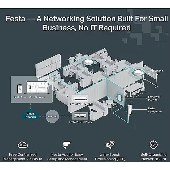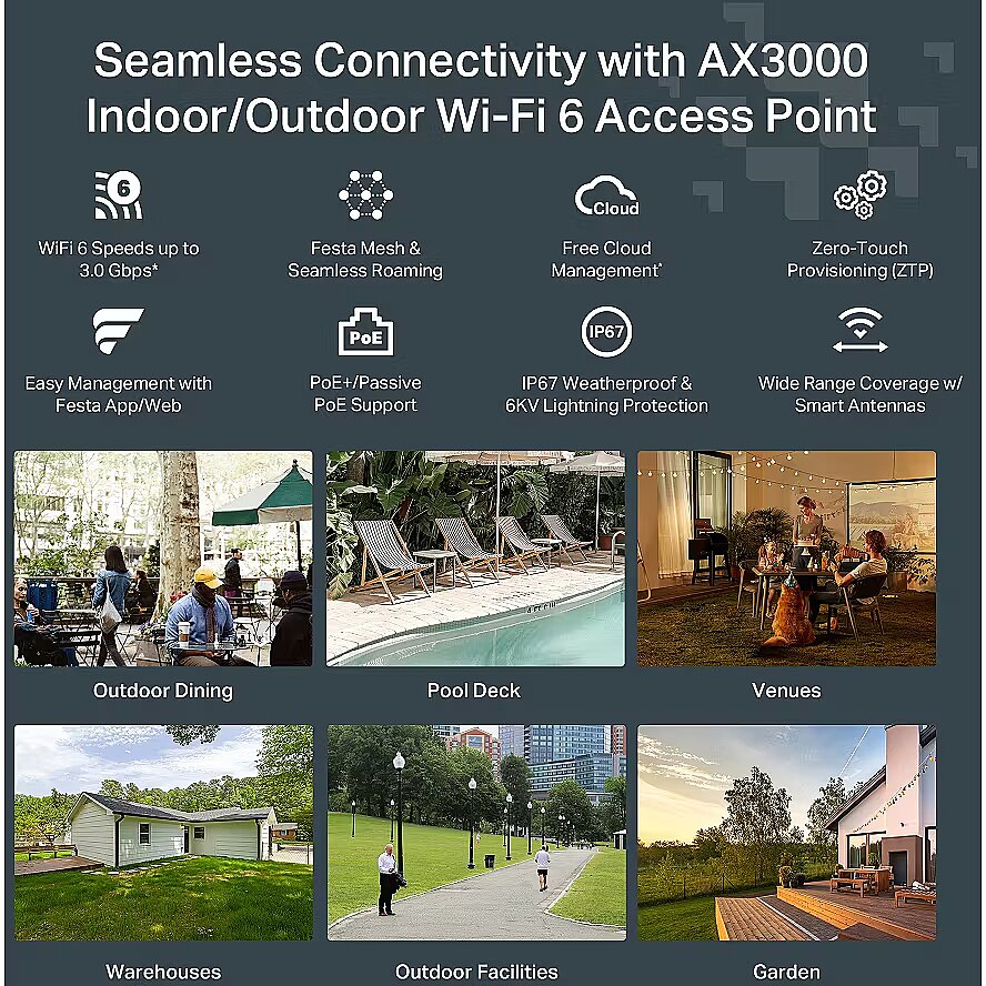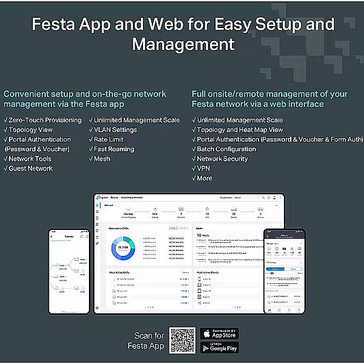 LongDesc - Festa 一 A Networking Solution Built For Small Business, No IT RequiredFesta offers business-class features with consumer-inspired simplicity. Our free cloud-based centralized management is accessible via the Festa app or web, providing essential features for small businesses without the complexity required by larger-scale operations.Wide Range Coverage for Multi-Device EnvironmentsEquipped with professional grade antennas with high-powered amplifiers, the Fest F65-Outdoor provides strong and expansive wireless coverage for multi-device environments. Utilizing Wi-Fi 6 technology including OFDMA and MU-MIMO, the Fest F65-Outdoor can handle simultaneous connections from dozens of clients in open areas.Smart Antennas for Superior WiFi PerformanceThe Festa F65-Outdoor delivers reduced interference, extended coverage, and enhanced performance through its professional antenna arrays and the intelligent algorithms of Festa Smart Antenna technology.Seamless WiFi 6 Mesh NetworkingThe Festa F65-Outdoor supports Seamless Roaming, ensuring users always connect to the most optimal access point. Additionally, it features Mesh technology, utilizing existing wireless signals to connect to hard-to-wire networks and reducing the need for redundant cabling.Easy and Flexible InstallationSelect the mounting option that best fits your preference.