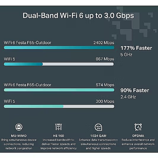ShortSummaryDescription - TP-Link Festa F65-Outdoor, 2.4 GHz, 5 GHz, 3000 Mbit/s, WPA-Enterprise, WPA-Personal, WPA2-Enterprise, WPA2-Personal, WPA3-Enterprise, WPA3-Personal