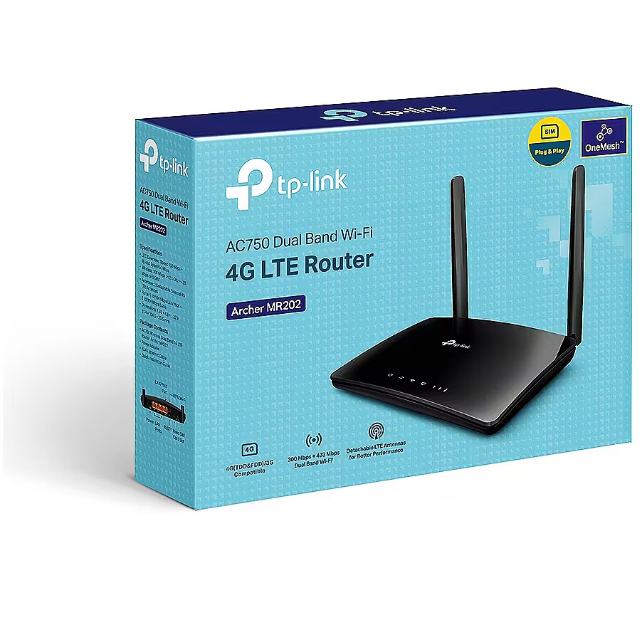 Description - Archer MR202 AC750 Wireless Dual Band 4G LTE Router Shares your 4G LTE network with multiple Wi-Fi devices and enjoy download speeds of up to 150 Mbps Powerful, integrated antennas provide stable wireless connections and better coverage Requires no configuration, just insert a SIM card and turn it on to enjoy a fast wireless connection Creates simultaneous dual band Wi-Fi networks, with maximum speeds of up to 300 Mbps on the 2.4GHz band and 433 Mbps on the 5GHz band Offers options and flexibility with the LAN/WAN port, allowing you to choose your connection type