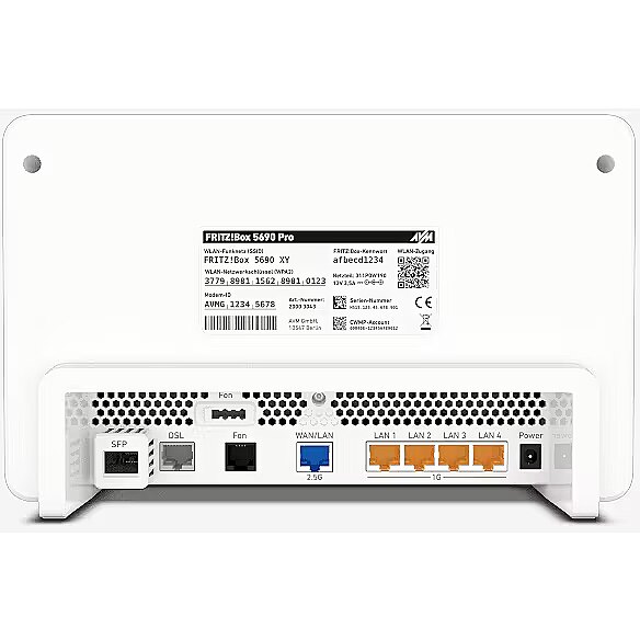 LongDesc - FRITZ!Box 5690 Pro – the full power of Wi-Fi 7 for fiber and DSLMaximum speeds with Wi-Fi 7 – including in the new 6 GHz band – for your fiber optic or DSL connection. A 2.5-gigabit WAN/LAN port, four gigabit LAN ports and USB 3.1 for ultimate connectivity. Zigbee and DECT for the FRITZ! Smart Home. Convenient telephony, intelligent security features for worry-free browsing and streaming. In short: The FRITZ!Box 5690 Pro is your pro for the digital home.Wi-Fi 7 - ultra high-speed Wi-Fi for your home networkTri-band Wi-Fi with support for Wi-Fi 7: The FRITZ!Box 5690 Pro takes your Wi-Fi to a new level with a total bandwidth of up to 18490 Mbit/s. You benefit from the highest data rates and smooth streaming even when there are multiple devices active at the same time. Even large data transfers in the home network are carried out in no time with the FRITZ!Box 5690 Pro. The new 6 GHz frequency band enables the highest speeds. Thanks to support for Wi-Fi 6E, you can get started immediately with many current smartphones and tablets.The seventh generation of Wi-Fi has a few tricks up its sleeve to help perfect your Wi-Fi experience: Multi-Link Operation (MLO) means Wi-Fi 7 devices can transmit data on multiple frequency bands simultaneously. With punctured mode, your Wi-Fi can circumvent interference. Your FRITZ!Box automatically ensures you have the best connection.The FRITZ!Box 5690 Pro also supports established standards such as Wi-Fi 6, 5 and 4, for full compatibility with your wireless devices.Mesh Wi-Fi with FRITZ!The FRITZ!Box 5690 Pro supports Mesh Wi-Fi, meaning your videos, music and photos seamlessly reach every corner of your home, apartment or office. FRITZ!Repeater, FRITZ!Powerline or other FRITZ!Box models adopt the settings of the FRITZ!Box at the internet connection and all devices are always optimally connected – automatically and reliably.With Mesh you enjoy high speeds while surfing, streaming or gaming. Instead of waiting for breathtaking 4k streaming and your favorite music, your media will wait for you.High speed directly at the fiber optic and DSL connectionThe FRITZ!Box 5690 Pro supports AON and GPON, the fiber optic standards commonly used in Europe. A FRITZ!SFP module is used to connect to the respective network. The FRITZ!Box 5690 Pro comes with FRITZ!SFP modules for AON and GPON fiber optic connections. If you obtain the FRITZ!Box 5690 Pro from your internet provider, you will receive the FRITZ!SFP module that matches your connection.Will fiber become available in your apartment or house at a later date? The FRITZ!Box 5690 Pro also supports DSL connections with up to 300 Mbit/s. With the FRITZ!Box 5690 Pro, you can use DSL today and be prepared for the fiber optics of tomorrow.The latest technologies for your home networkMaximum speed for your home network with the FRITZ!Box 5690 Pro: Incredibly fast Wi-Fi on three bands, a 2.5-gigabit LAN/WAN port and four gigabit LAN ports. The powerful hardware ensures a lightning-fast user interface and FRITZ!Apps.Automate your Smart Home with ZigbeeThe FRITZ!Box 5690 Pro is the ideal hub for your smart home, offering practical automation for energy, heating, lighting and more. Control your Smart Home devices with schedules, scenes or routines. The FRITZ!Box supports Smart Home products via DECT. It also integrates smart home devices from other manufacturers, such as LED lights, via Zigbee. The FRITZ!App Smart Home is the ideal remote control for your FRITZ! Smart Home, both at home and on the go.The USB 3.1 port is perfect for FRITZ!NAS and the FRITZ! media server: Connect an external hard drive to your FRITZ!Box and you have access to it throughout your home network.Phone calling funThe FRITZ!Box 5690 Pro gives you comprehensive telephony convenience: you can connect one analog phone and up to six DECT phones. In addition, you can set up up to five answering machines and manage call lists. Notifications about missed calls or incoming voice messages ensure you're always up to date. You can also sync your online contacts from Google, Apple and more with your FRITZ!Box.FRITZ!Box, for safety's sakeThe security concept covers all FRITZ!Box areas: secure browsing thanks to the built-in firewall, Wi-Fi protected with an individual network key upon delivery, and guest access that lets friends and family access the internet but not your home network. These and many other features make your communication secure.FRITZ!OS: The genius behind FRITZ!FRITZ!OS is the smart operating system for all FRITZ! products. It combines ease-of-use with versatile features and comprehensive security. A clear user interface and wizards accompany you every step of the way. Regular updates keep your FRITZ!Box up to date – you can also turn on automatic updates.
