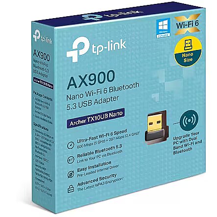 AX900 Nano Wi-Fi 6 Bluetooth 5.3 USB Adapter High Speed WiFi – Up to 900 Mbps speeds with 287 Mbps on 2.4 GHz and 600 Mbps on 5 GHz, upgrades your devices to higher AX WiFi speeds. Dual Band Wireless – 2.4GHz and 5GHz band for flexible connectivity, upgrades your devices to work with the latest dual-band WiFi router for faster speed and extended range. Reliable Bluetooth 5.3 – Bluetooth 5.3 has been enhanced in terms of reliability and security, which ensures a more robust coordination with your game controllers, headphones, keyboards an etc. Nano design – Small, unobtrusive design allows you to plug it in and forget it is even there Operating System – Supports Windows 11/10 Advanced Security – Supports WEP, WPA/WPA2/WPA3, WPA-PSK/WPA2-PSK, WPA3-SAE encryption standards