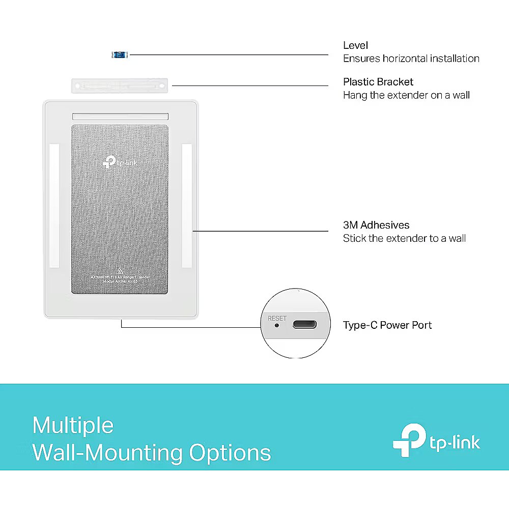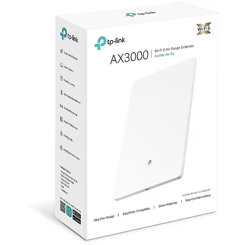 LongDesc - Ultra-Thin Design,Extraordinary PerformanceAX3000 Wi-Fi 6 Air Range ExtenderUltra-Thin and Minimalist DesignArcher Air E5 has a compact size of 210×148×8 mm and is even thinner than a wall outlet. The pure white shell, minimalist lines and rounded corners form an elegant appearance and make Archer Air E5 better integrated with modern home interiors. The LED and WPS 2-in-1 button on the front and the Type-C power port on the bottom further simplify Archer Air E5’s look.Flexible Installation, Ultra ConvenienceArcher Air E5 is designed to easily mount onto walls and offers multiple installation methods. With two 3M adhesives on its back and a plastic bracket accessory, you can paste or mount it on a wall.** Its freer placement also saves electrical socket space.Live in the Fast Lane with WiFi 6Armed with AX3000 WiFi 6, Air E5 is built to deliver a huge boost in speed, capacity, and coverage.Smart Antennas for All-Round CoverageArcher Air E5’s built-in smart antennas use intelligent algorithms to auto-detect your devices’ locations and switch to the optimal antenna arrays, ensuring all-round stable signals even in duplex houses.Boosted WiFi Signals Throughout Your HomeArmed with 4× powerful FEM and built-in smart antennas, Archer Air E5 boosts WiFi signals throughout your home. Beamforming technology detects devices and concentrates signals towards them, especially in hard-to-reach areas.Flexibly Create Whole Home Mesh WiFiArcher Air E5 is EasyMesh-compatible. If you have any WiFi dead zones at home, simply add another EasyMesh router to further form your whole home mesh WiFi. No more searching for a stable connection. For a better network experience, we recommend combining with Archer Air R5.Advanced Features Made for SpeedAdaptive Path SelectionKeeps your network running at top speed by automatically choosing the fastest connection path to the router.High Speed ModeHelps you get the most out of your HD entertainment by using one dedicated band as a backhaul and another as an access point to maximize the overall performance of your wireless network.Control at Your FingertipsSet up and manage your WiFi through the TP-Link Tether app from your phone (Android, iOS). Network management has never been easier.