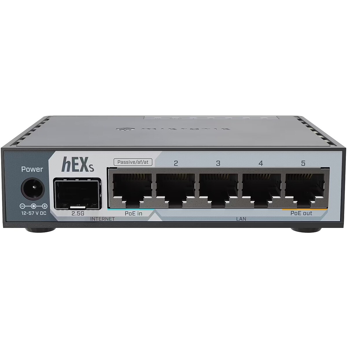 Description - MIKROTIK hEX S (2025) A compact, affordable wired router featuring a 2.5G SFP port, 5x Gigabit Ethernet, PoE out, USB, and a fast dual-core CPU — ideal for homes, offices, or underfunded labs that need reliable performance. With 5× Gigabit Ethernet ports (including PoE-in on port #1 and PoE-out on port #5), plus a 2.5 Gigabit SFP cage, this compact router can adapt to many roles. And unlike most ISP boxes, you can assign any port as WAN, LAN, or bridge — full flexibility right out of the box. That’s just the beginning. RouterOS v7 gives you advanced routing, VLANs, bonding, traffic shaping, and more — so you can build the wired network you’ve always wanted.