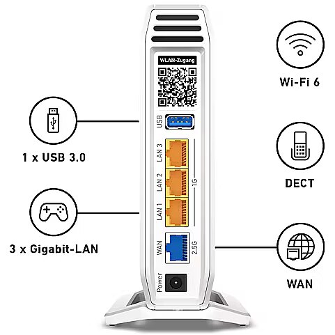 Technical_details - FRITZ!Box 4060, router The FRITZ!Box 4060 with innovative WiFi 6 (WLAN AX) brings ultra-fast WiFi to the home network. Wi-Fi 6 is faster and significantly more efficient: the FRITZ!Box 4060 effortlessly masters several parallel applications such as 4K streams, video conferences and cloud applications. As a tri-band WLAN router with a data throughput of up to 6,000 Mbit/s and a 2.5 gigabit LAN connection, the FRITZ!Box provides large performance reserves for the most demanding applications and is ideal for a very fast Internet connection via fiber optics or cable. In the VPN and USB area, the gigabit limit can be significantly exceeded. A DECT base for cordless telephony and smart home applications completes the wide range of communication options in the home network. Type: Router EAN: 4023125029318 Manufacturer number: 20002931 Design: desktop Area of application: gaming, home networks Connections: Network | RJ-45 | 4x (of which: 3x 10/100/1000, 1x 100/1000/2500) Connectors: Features | Auto MDI/MDIX Connections: Other | 1x USB-A 3.2 Gen 1 (5 Gbps) Connections: The designation USB 3.2 Gen 1 corresponds to the earlier designations USB 3.1 Gen 1 or USB 3.0. WLAN: Standards | Wi-Fi 3 (802.11a), Wi-Fi 3 (802.11b), Wi-Fi 3 (802.11g), Wi-Fi 4 (802.11n), Wi-Fi 5 (802.11ac), Wi-Fi 6 ( 802.11ax) - (2.4GHz, 5GHz) WiFi: Encryption | WPA2, WPA3 WLAN: transfer rate | 1200 MBit/s (WLAN 2.4 GHz), 2400 MBit/s (WLAN 5 GHz) WLAN: Features | mesh LEDs: Activity, Power, LAN link LEDs: 1x Power supply: power supply connector Feature: Connection to any fiber optic, cable or DSL modem via WAN port | Internet access also via WLAN, mobile phone sticks or as an IP client | Secure Internet use with a preset firewall | Future-proof thanks to support for the Internet protocol IPv6 | Secure and high-performance remote access to the home or company network via VPN Accessories: available | Power adapter, LAN cable, quick start guide
