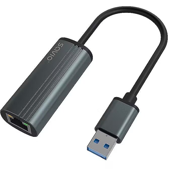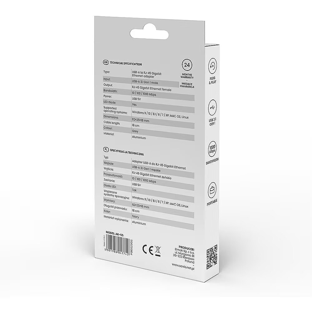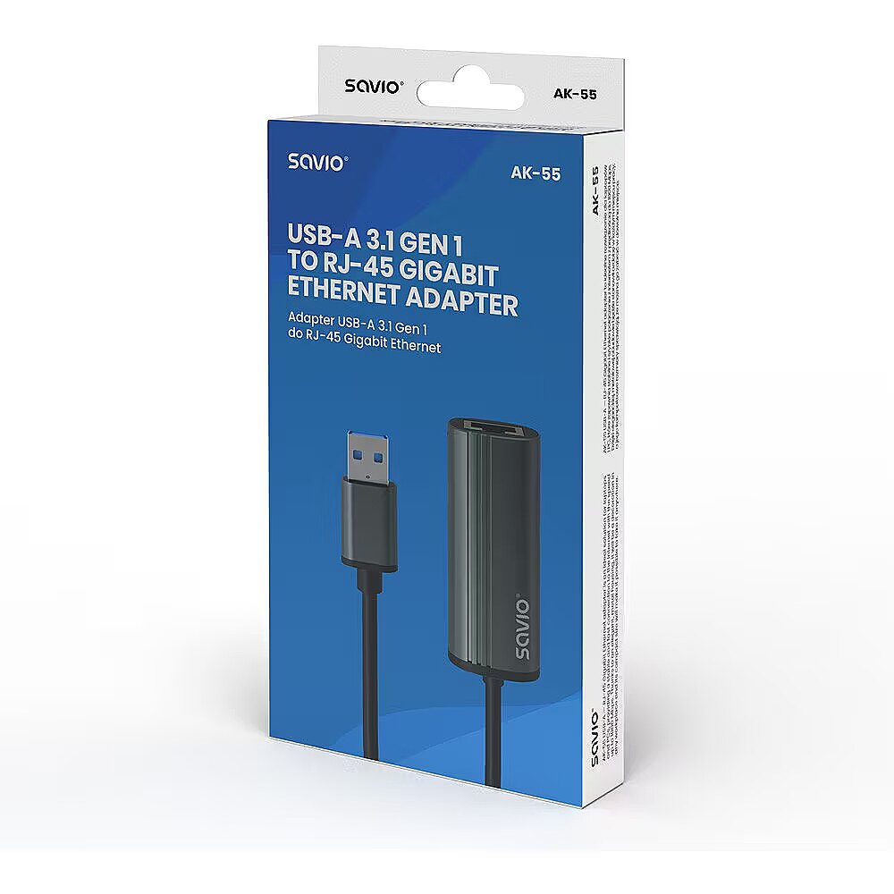 Description - Adapter USB-A to RJ-45 AK-55   USB 3.1 Gen 1 1000 Mbps The SAVIO AK-55 adapter is the ideal solution for laptops and PCs, providing a stable and fast connection to the Internet with speeds of up to 1000 Mbps. The device uses a universal USB-A 3.1 Gen 1. connector and a female RJ-45 Gigabit Ethernet socket. Plug & Play Connecting the AK-55 is extremely simple. You only need to plug it into the USB-A port on the output device. It works in Plug & Play mode, so no driver installation or additional configuration is required. Portable The modern AK-55 Adapter has been retained in a dark grey matt colour scheme and is made of aluminium. Its compact dimensions and low weight mean that it can be taken anywhere. The handy device looks extremely elegant and increases the comfort of using multimedia devices.