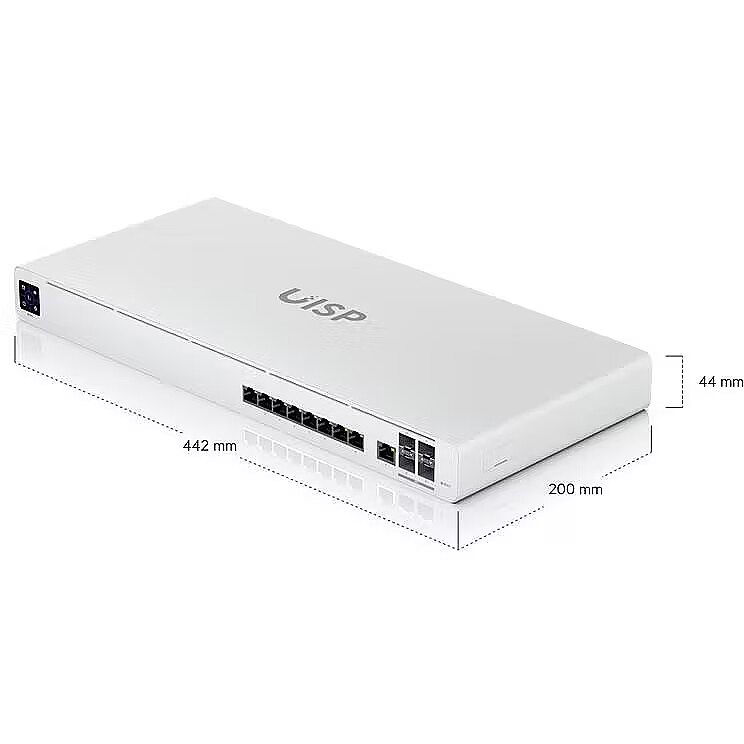 Description - Professional UISP router Multi-WAN 10GbE router designed for ISP applications. (9) GbE RJ45 ports (4) 10G SFP+ ports Integrated Layer 2 switch* NAT throughput up to 9500 Mbps** Traffic shaping functionality and automatic customer suspension Firewall and OSPF routing Additional Power TransPort input for DC redundancy *Ports 1-8, 10-13 can be configured for line-rate Layer 2 switching. **Up to 2250 Mbps with QoS enabled; up to 7500 Mbps with IP Accounting enabled.