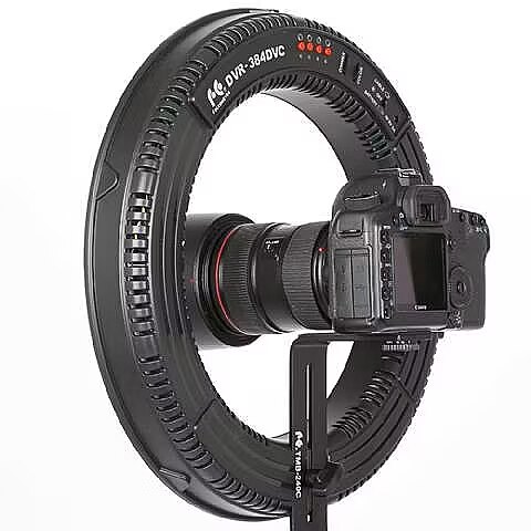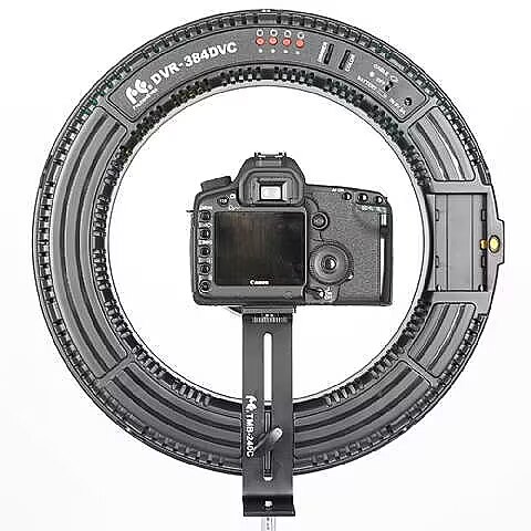 description_en - The DVR-384DVC from Falcon Eyes is a professional ring lamp, where you can set both color temperature and intensity steplessly. Thanks to the included mounting bracket, you can easily place the DVR-384DVC on a tripod. On the bottom of the DVR-384DVC you can find a 1/4" and 3/8" screw thread, which makes it compatible with almost any tripod. You can attach the camera easily on the mounting bracket, because of the screw thread connection. The 384 LED-lights of the DVR-384DVC spread the light on a small angle of 60 degrees. They have a CRI value of > 95 en last up to 50.000 hours.