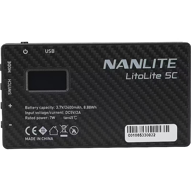 description_en - The Nanlite LitoLite 5C RGBWW Mini LED Panel is an amazingly bright, pocket-sized lighting fixture featuring an internal Li-ion battery with USB-C charging, adjustable color temperature from 7500-2700 K with green to magenta shift, 360° of hue control with 100 levels of color saturation adjustment, as well as 15 pre-programmed adjustable special lighting effects. Studio Quality Lighting in Your Pocket